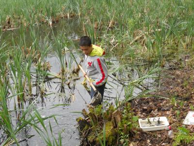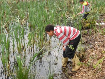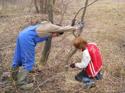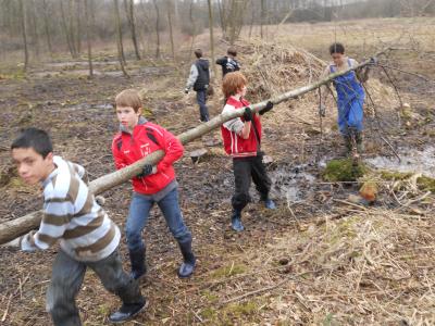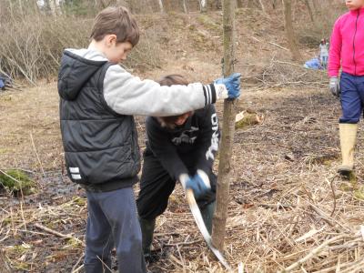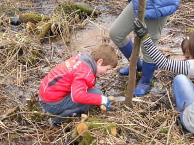 Onze taak was om er voor te zorgen dat het gebied niet dichtgroeit met enkel bomen. Een externe firma had al heel wat bomen weggezaagd. De kleintjes waren voor ons. Laarzen waren dit jaar wel echt nodig. Kobe en Lisanne mochten de diepte van sommige moerasstukken wel aan den lijve ondervinden![]()