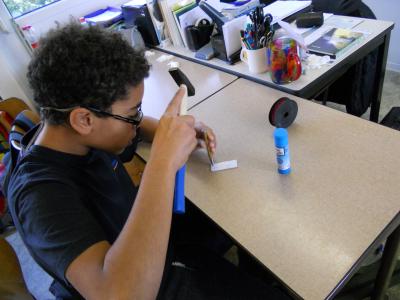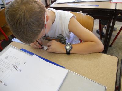 Eerst vijlden we de kantjes eraf, daarna kregen we een klein blaadje papier. We moesten het plaatje op het papiertje leggen en natekenen. Dan uitknippen, je naam erop en plakken op je plaatje. Daarna moesten we de centerpons gebruiken om onze naam erin te kloppen.