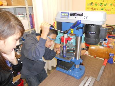 Je moet er voorzichtig mee zijn, als je uitschuift, dan wordt het niet zo mooi. Tot slot moesten we een gaatje boren. Om je ogen te beschermen moesten we een bril opzetten.