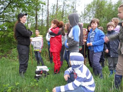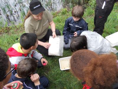 De klas werd in twee verdeeld: één groep bleef bij Liselotte voor wateronderzoek, de andere groep ging met Patrick (Orchis) een natuurwandeling maken rondom het natuurgebied.